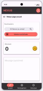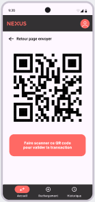 Envoyer des PO : L’utilisateur doit compléter un formulaire (destinataire, montant, message) afin de fournir les informations utiles à la transaction. Il a également l’opportunité de scanner un QR Code pour gérer ce transfert. Ce QR Code doit être scanné par l'émetteur.
