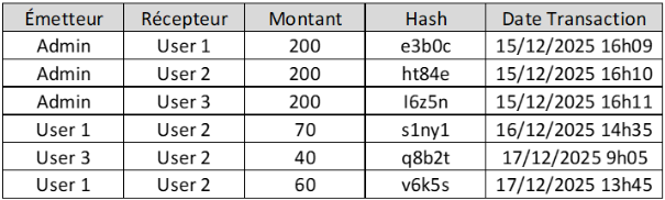 La table de transactions ne possède que 4 colonnes : émetteur, récepteur, montant et un hash. Le hash est utilisé pour vérifier si la transaction n’a pas été modifiée, puis un nouveau hash est calculé pour chaque transaction en fonction du hash de la transaction précédente et des informations de la transaction. Si le hash ne correspond pas à ces valeurs, cela signifie que la transaction a été modifiée.