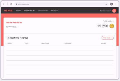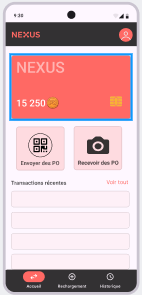 Page d’accueil : Cette page sera visible dès la connexion d’un utilisateur. Il peut y retrouver son solde actuel (en PO) et ses transactions récentes. Il a également l’occasion d’envoyer des PO ou de recevoir des PO grâces aux deux boutons disponibles.